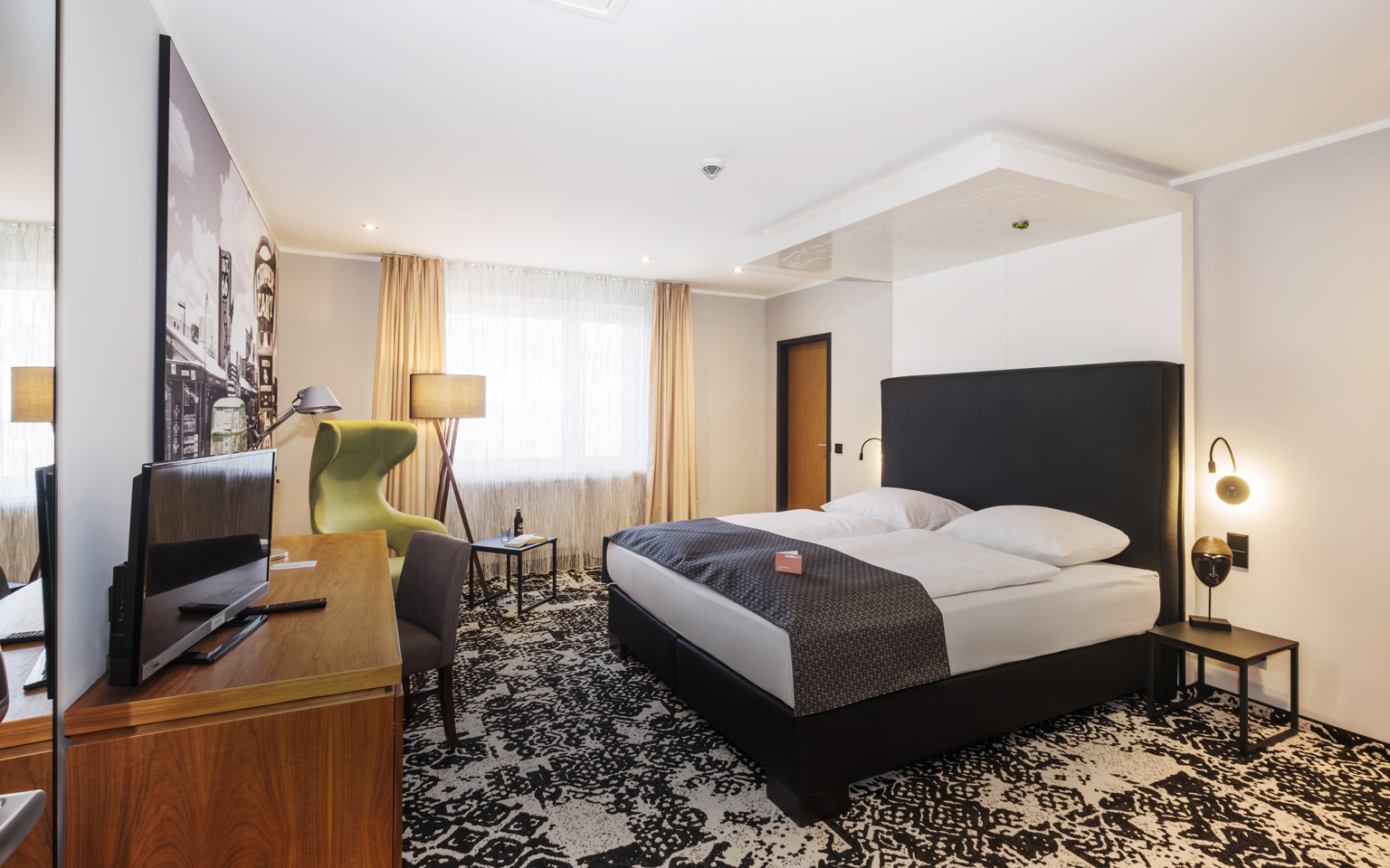 Einchecken und sich wohlfühlen. Unsere geräumigen Doppelzimmer bieten Ihnen ausreichend Platz und sind jeweils mit einem modernen Bad sowie einem Fernseher ausgestattet. Im Zimmer und im gesamten Hotel steht Ihnen kostenloses WLAN zur Verfügung. Genießen Sie außerdem die Annehmlichkeiten unseres Hauses wie den Fitnessbereich, unsere Terrasse zum Relaxen, das Spielzimmer für Ihre Kinder, den Parkplatz (gegen Aufpreis) u. v. m.